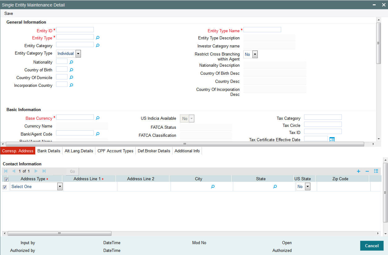 Refer the chapter ‘Maintaining Reference Information’ of FC-IS system for a discussion of the other fields common to all entity type.