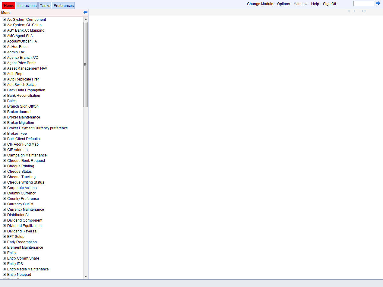 You must choose the module of your Fund Manager AMC installation in which you are going to operate in, in the AMC Branch field. When you choose the module, the menu that is accessible to you, according to the definitions made in your user profile, are displayed.