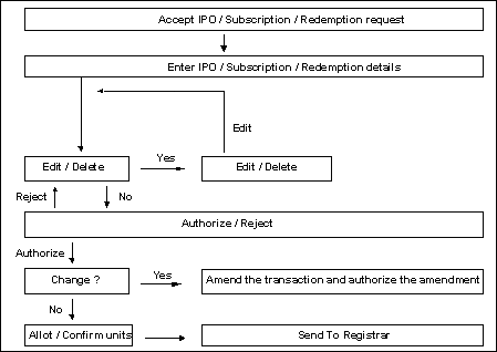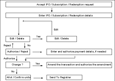 The system validates the details that were entered against the fund rules. The fund manager allocates the IPO subscription/ subscription based on the NAV declared for the fund for that day. After the allocation, the agency branch can print the confirmation/ rejection note.