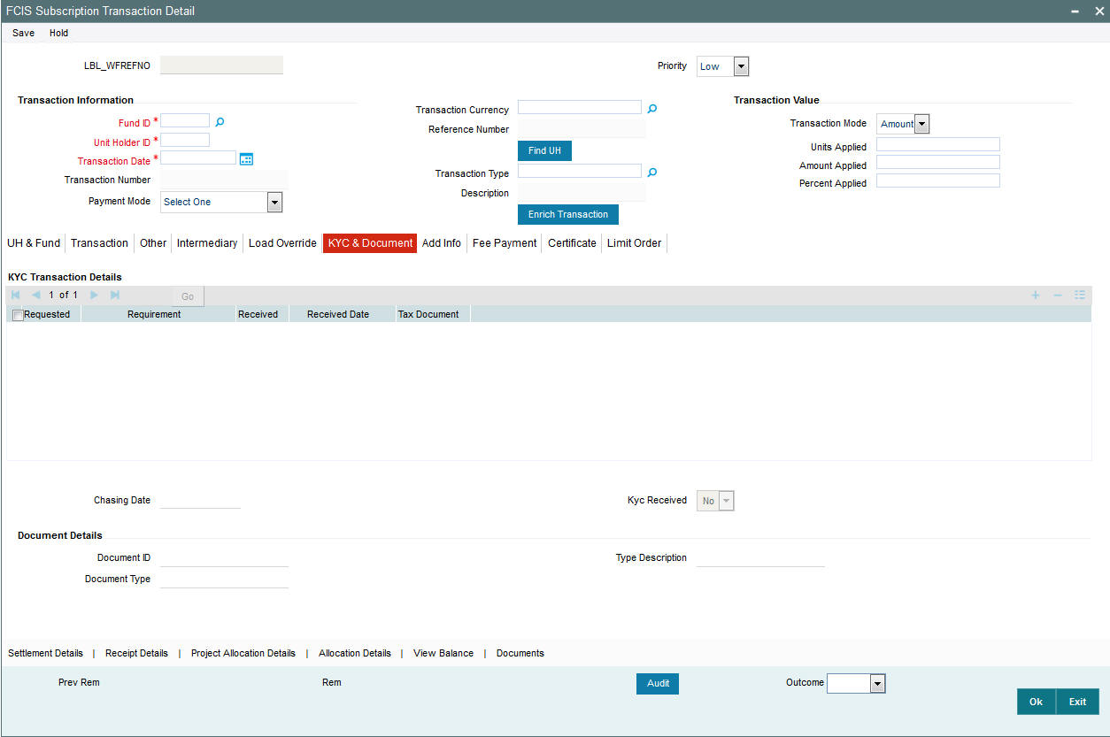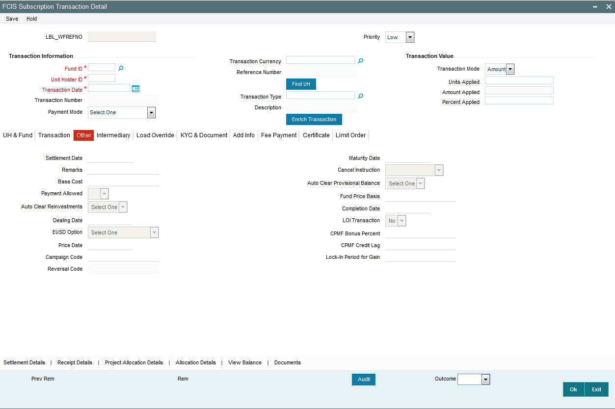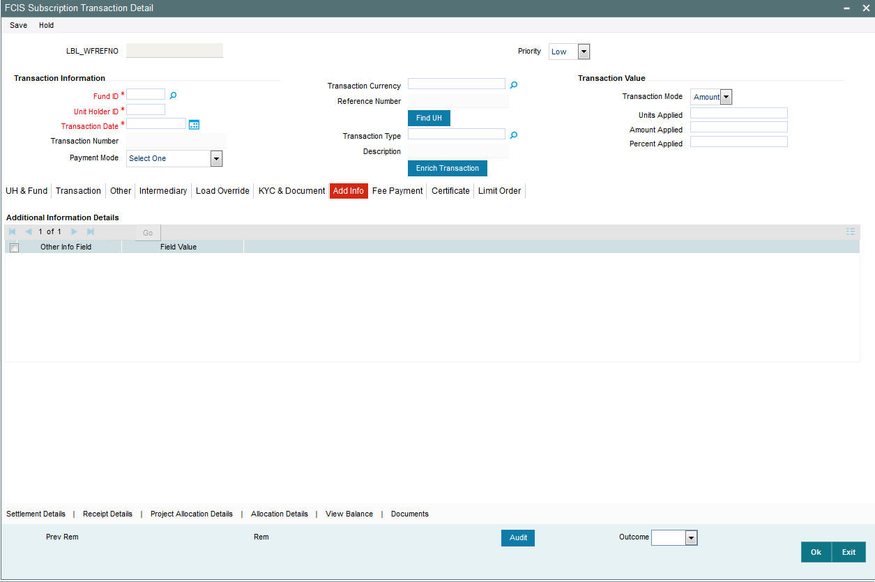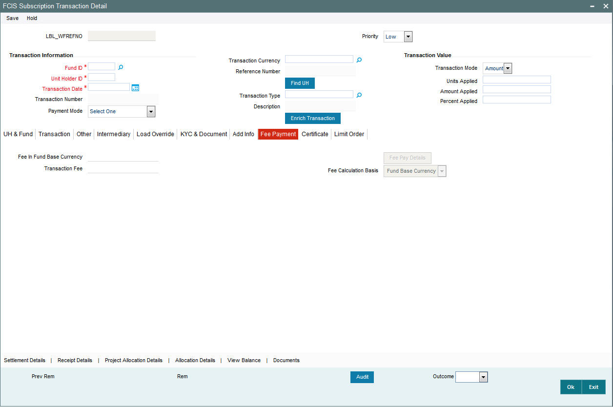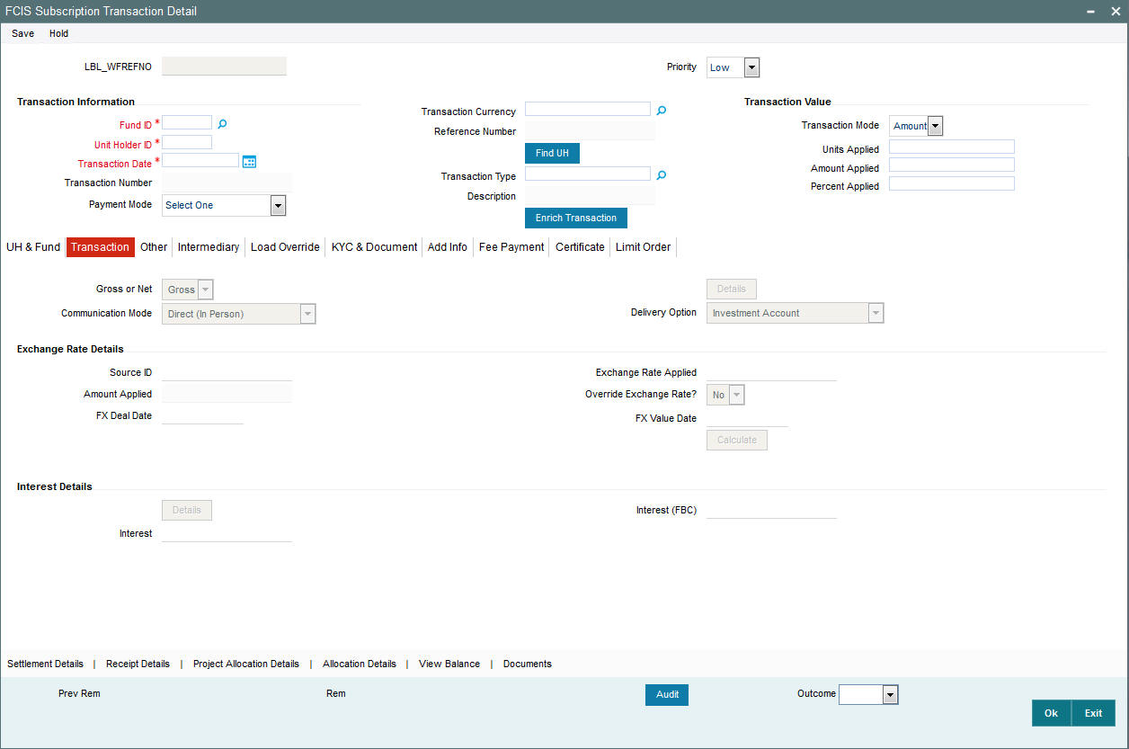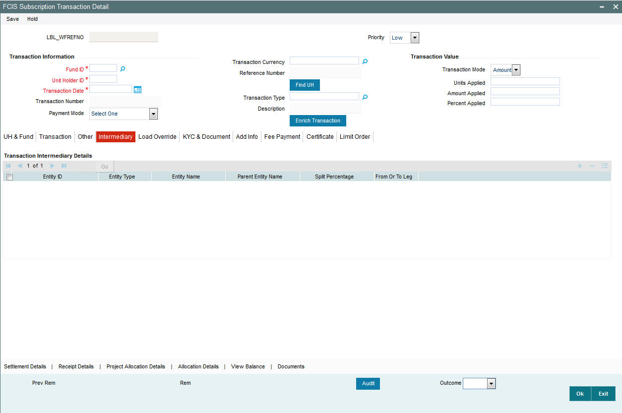 Once you have entered all the details of the transaction click on Enrich Transaction. The relevant details of the transaction are defaulted in the UH and Fund Section.