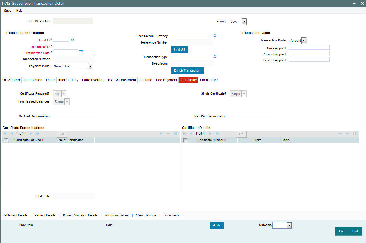 If you have selected a certificate option fund, then all certificate information fields are enabled. You can enter the following details: