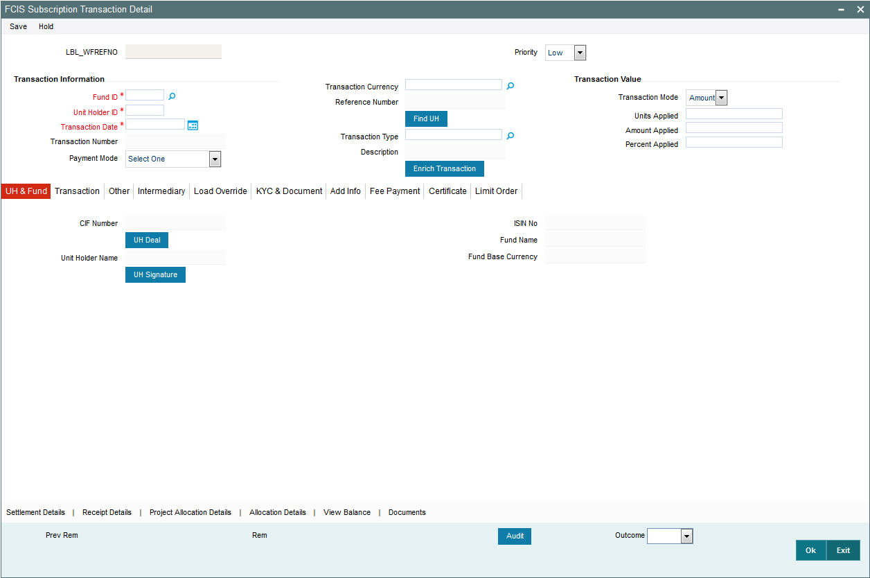 From the find UH button, specify the CIF Number and then choose the required unit holder in the Unit Holder field, or else specify the ID of the unit holder in the Unit Holder field. You must select a CIF or unit holder that is not restricted (or does not belong to a restricted category) for the fund into which the transaction is being entered. If not, the system does not allow the transaction to be saved.