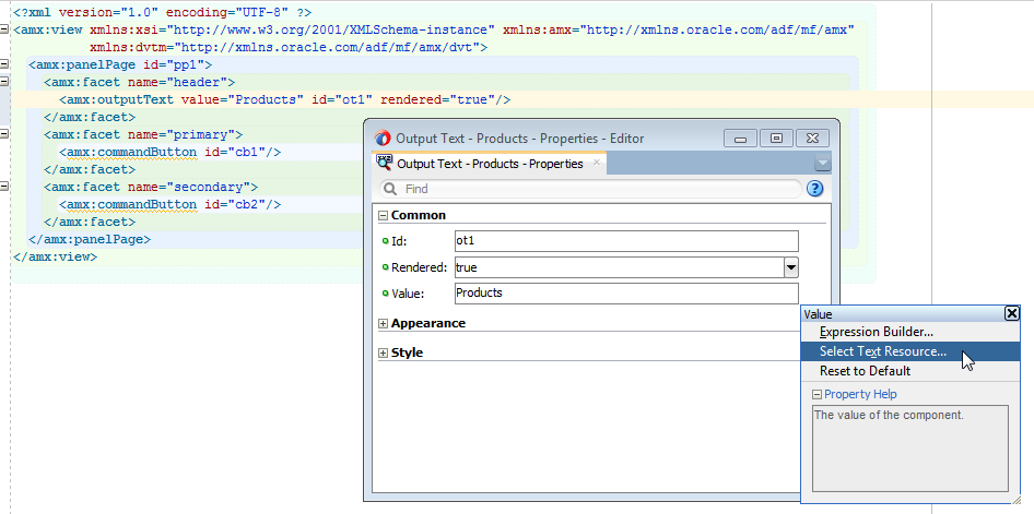 これらの要素は、概要エディタを使用して宣言的に変更するか(図4-2を参照)、「ソース」エディタを使用して手動で変更できます。この2通りのアプローチは、どちらも同じように使用できます。