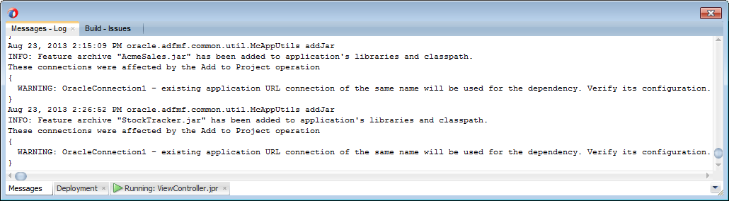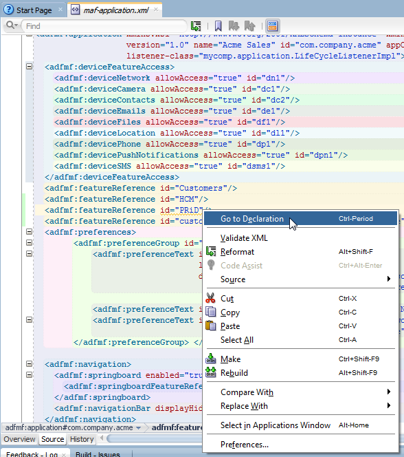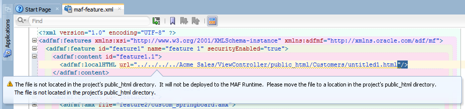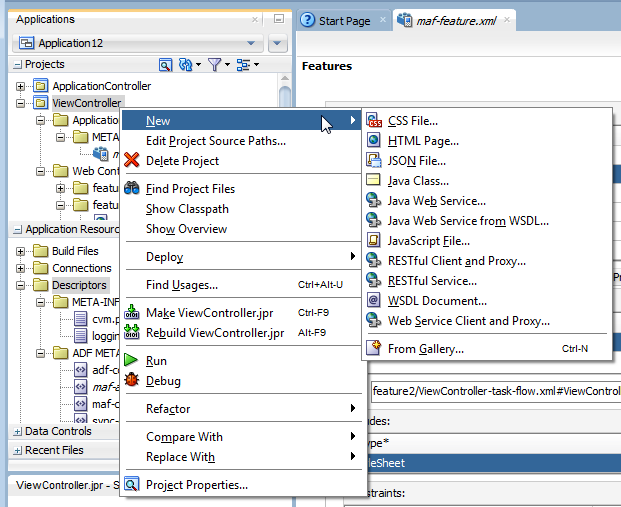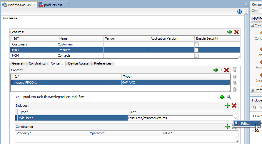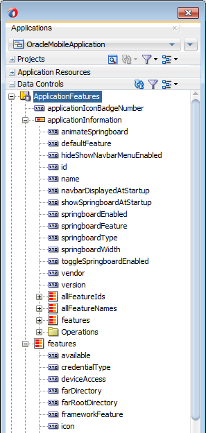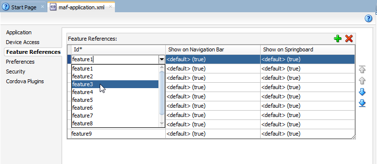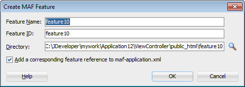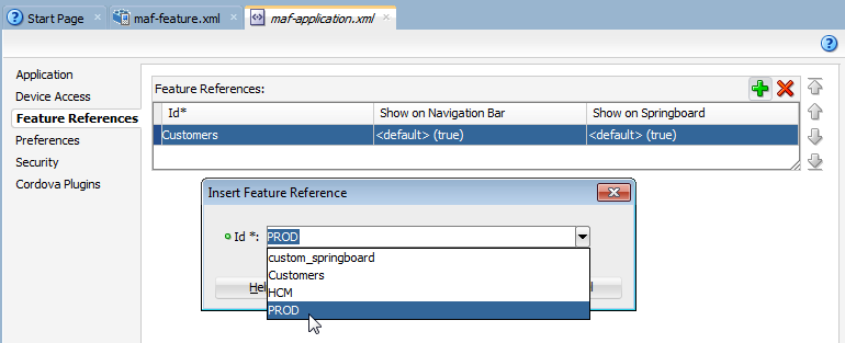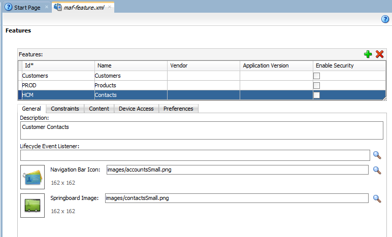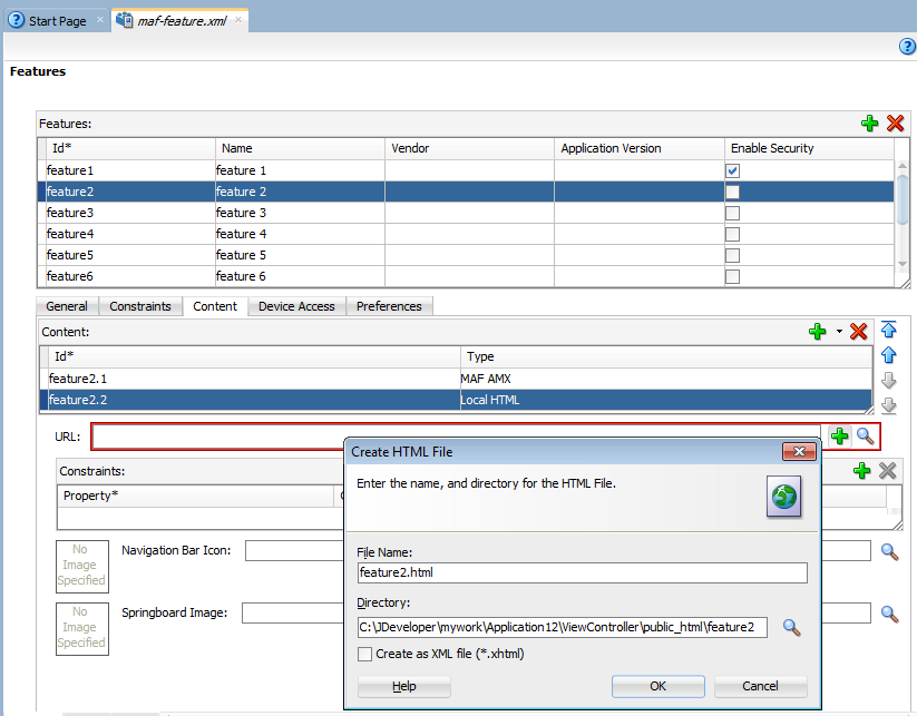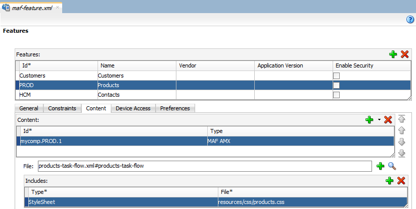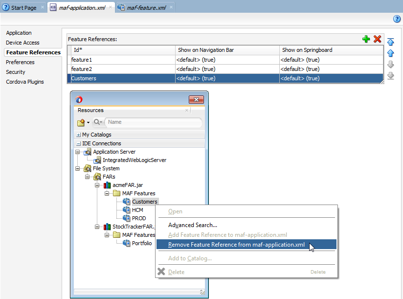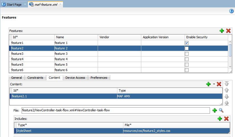 モバイル・アプリケーションには1つ以上のビュー・コントローラタイプのプロジェクトを含めることができます。これらにはそれぞれ、maf-feature.xmlファイル内の一連の機能が記述されています。第3章「モバイル・アプリケーション開発のスタート・ガイド」で説明したように、MAFは、モバイル・アプリケーションそのものに対してmaf-application.xml構成ファイルを、アプリケーションのコンテンツ定義用にmaf-feature.xmlファイルを提供しています。これらのファイルは手動で変更することもできますが、MAFでは、これらのファイルを宣言的にビルドできるようにする2つの概要エディタを提供しています。