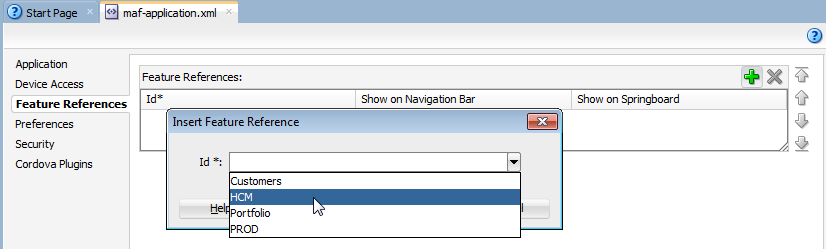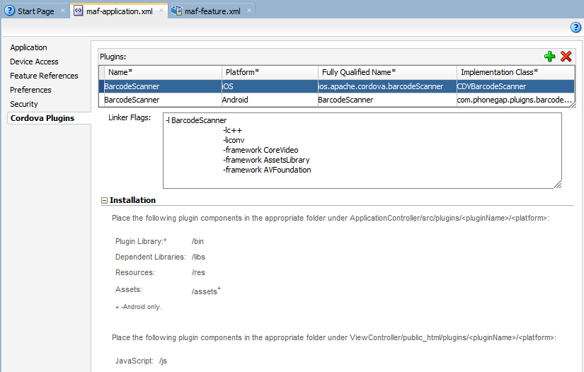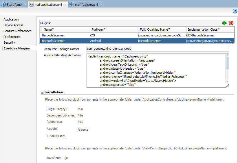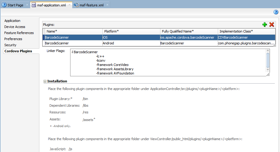 maf-application.xmlの概要エディタとそのダイアログの「Cordovaプラグイン」ページを使用して、Cordovaプラグインを統合します。