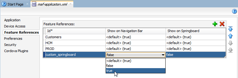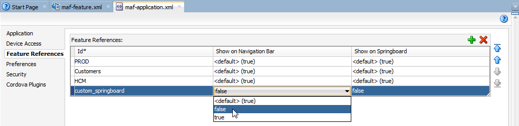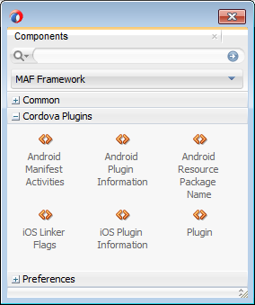 概要エディタまたは「コンポーネント」ウィンドウから「Cordovaプラグイン」コンポーネントを使用すると、maf-application.xmlファイルに<adfmf:cordovaPlugins要素が移入されます(図4-32を参照)。この要素とその子要素の詳細は、Oracle Fusion Middleware Oracle Mobile Application Frameworkのタグ・リファレンスを参照してください。