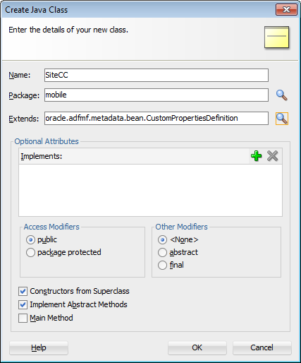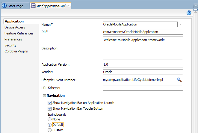 デフォルトのアプリケーション・リスナー・クラスは、application.LifeCycleListenerImplです。MAFでは、デフォルトではこのクラスは登録されません。このクラスはJVMを起動するため、各モバイル・アプリケーションには適さない可能性があるからです。かわりに、「プロパティの編集」ダイアログ(図4-5を参照)を使用して、手動でこのクラスを登録する必要があります。このダイアログを閉じると、JDeveloperにより、<adfmf:application>要素がlistener-class属性によって更新されます(例4-2を参照)。