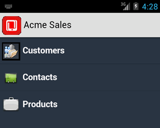 例4-1は、Acme Salesという名前のアプリケーションのmaf-application.xmlファイルを示しています。Acme Salesはモバイル・アプリケーションで、そのコンテンツには顧客のコンタクト先アプリケーション(<adfmf:featureReference id="customers" showOnNavigationBar="true"/>)が含まれています。このアプリケーションはSpringboardに表示されます(図4-1参照)。