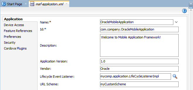 カスタムURLスキームを登録します。このURLスキームは、maf-application.xmlファイルの概要エディタで、「URLスキーム」フィールド(図4-4を参照)を使用して構成します。次に、このスキームのURLを使用して、モバイル・アプリケーションを起動し、データを渡すことができます。