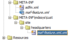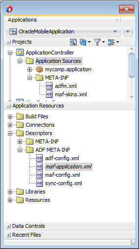 maf-application.xmlファイルの概要エディタを開くには、「アプリケーション・リソース」パネルのADF META-INFノード(図4-3を参照)にあるmaf-application.xmlファイルをダブルクリックします。