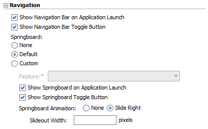 「アプリケーション」ページの「ナビゲーション」のオプション(図4-6を参照)を使用して、ナビゲーション・バーを表示または非表示にしたり、アプリケーションによって使用されるSpringboardのタイプを選択したり、ユーザーがアプリケーションをめくるように見ていくときのSpringboardの反応方法を定義できます。