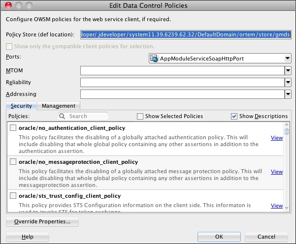 注意: ファイアウォールで保護されている環境で、ファイアウォール外にあるWebサービスを使用する場合は、JDeveloperで「Webブラウザとプロキシ」の設定を構成する必要があります。詳細は、第8.7項「ブラウザ・プロキシ情報の構成」を参照してください。 |