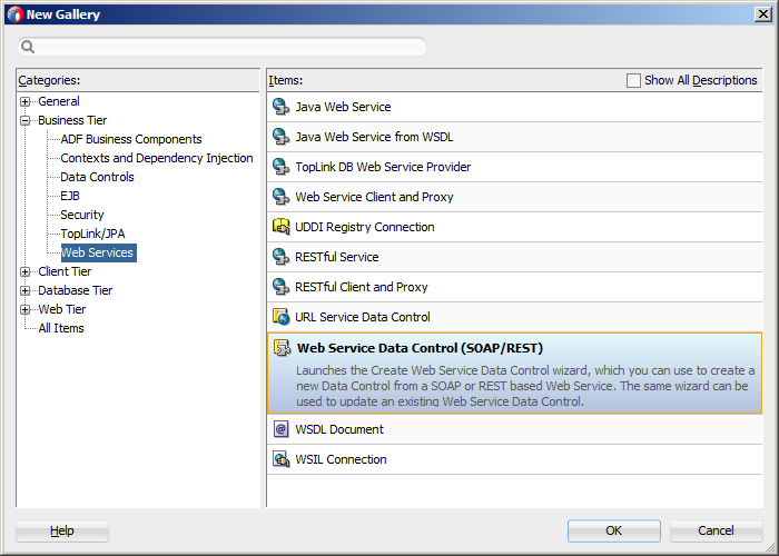 「新規ギャラリ」ダイアログで、左側の「ビジネス層」ノードを開いて「Webサービス」を選択します。右側の「アイテム」リストから「Webサービス・データ・コントロール(SOAP/REST)」を選択して(図8-1を参照)、「OK」をクリックします。