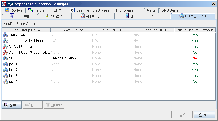 Each Location must have a Default User Group. The Default User Group must contain every IP address on the LAN that will participate in the application network. You created a Default User Group in the Location Wizard when you created your Location gateway personality, but you can modify this group using the following procedure. To configure the Default User Group, select the Default User Group entry on the main screen of the User Groups tab and select the Edit button. The Edit User Group 'Default User Group' screen will be displayed