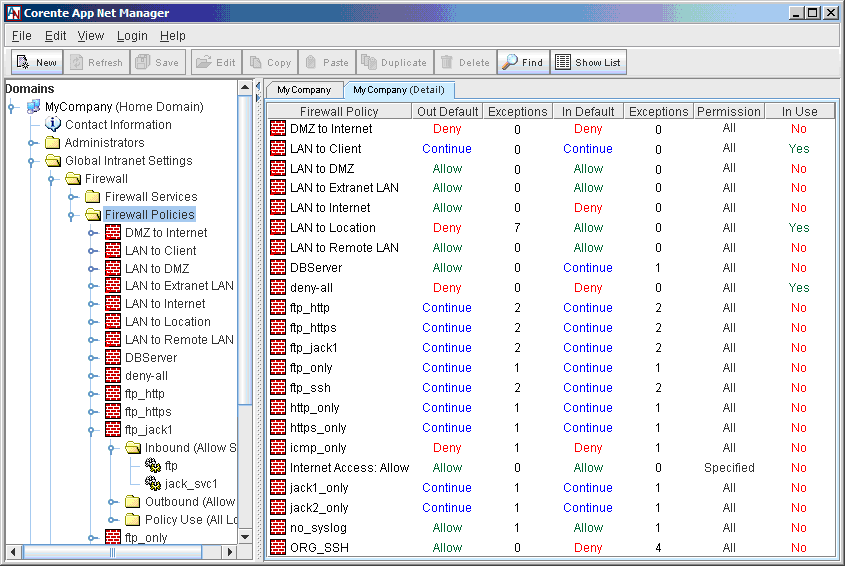 To view the definition of an existing Firewall Policy, open the Firewall Policy's branch in the domain directory. Three categories will be displayed: Inbound, Outbound, and Policy Use.