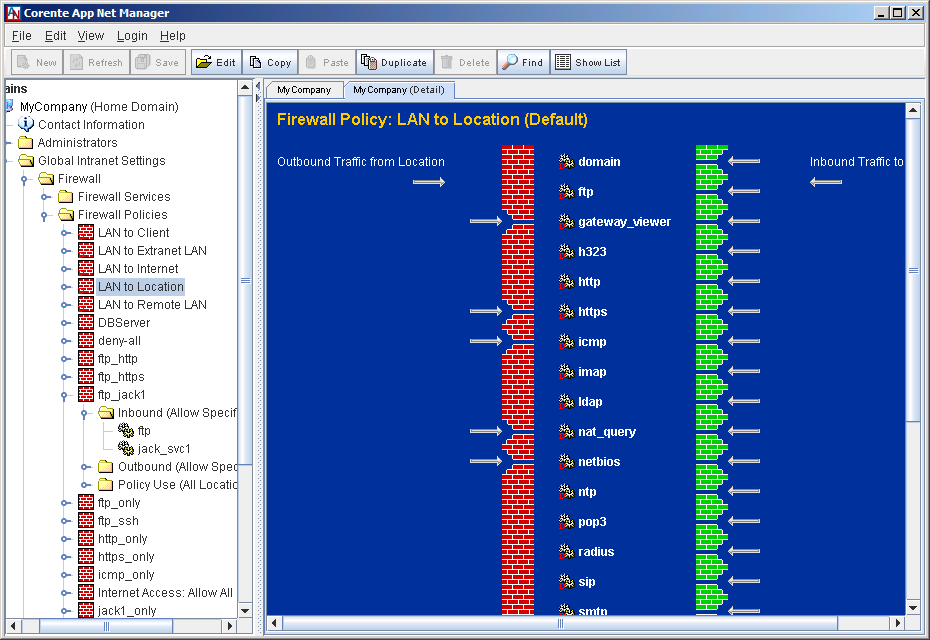 All of the Firewall Services that have been defined in your domain will be listed in a column in the middle of the screen. On either side of this column are brick walls, representing the firewall both outbound and inbound.