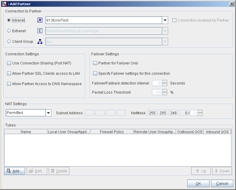 The Tubes table on the Partners tab lists all of the tubes that you have already configured for this Location in the partnership. If you have multiple tubes, you can rearrange the order in which they are applied to traffic by using the Up and Down buttons. Traffic will attempt to use the tubes in the specific order in which they appear on this table. For more information about the importance of tube order, refer to Important Notes About Tubes.