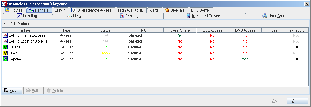 The main Partners tab presents a table of all partners that you have already added as well as four default partners: LAN to Internet Access, LAN to Location Access, DMZ to Internet Access, and LAN to DMZ Access. You may Edit or Delete any partner listed in the table. For information about the LAN to Internet Access and LAN to Location Access partners, refer to Appendix B, Additional Tube Configurations. For information about the DMZ to Internet Access and LAN to DMZ Access, refer to Appendix C, Implementing a DMZ with Corente.