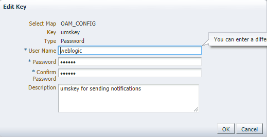4. Enter the UMS key credentials such as User Name, Password, Confirm Password and Description. Make sure that OAM_CONFIG is selected in Select Map and Type is selected as Password.