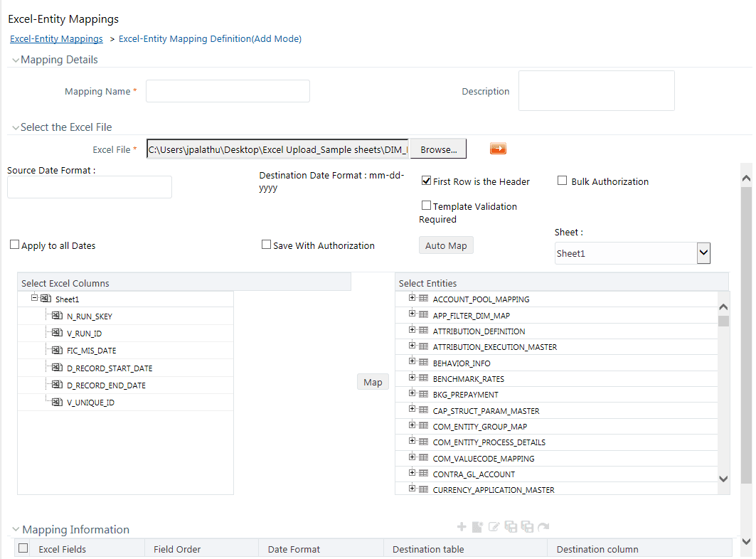 You need to map these fields to the corresponding columns in the Select Entities grid. The value for Maker ID column is updated with the User ID of the user who is performing the Excel Upload. The value for Maker Date is updated with the current System Date during which the upload is performed and the value for Authorization Status is updated with flag 'U'. See Save with Authorization to create a Form where the uploaded data can be authorized.