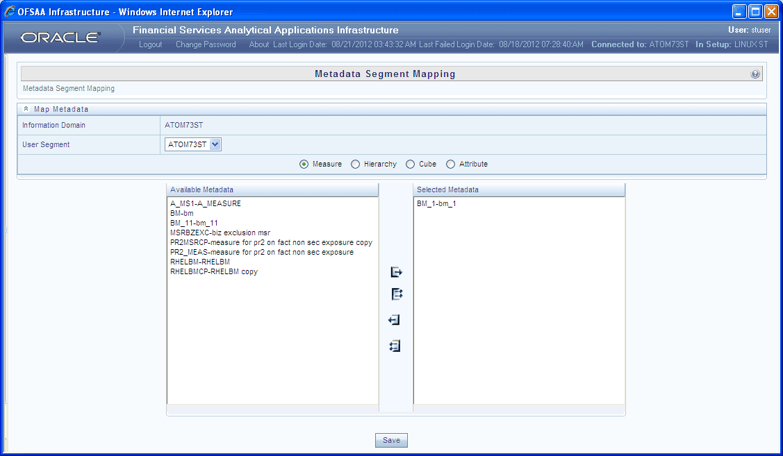 You (System Administrator) need to have SYSADM function role mapped to your role to access Metadata Segment Mapping window. By default this window displays the Information Domain Name to which you are connected along with the metadata details of Measure.