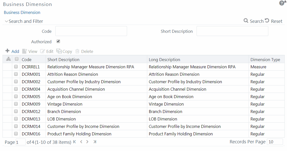 You can also make search for a specific business dimension based on the Code, Short Description, and Authorization status or view the list of existing business dimensions within the system.