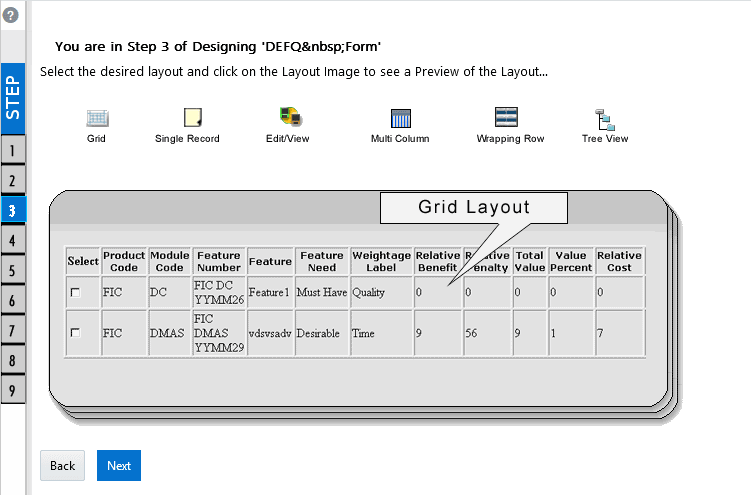 2. Click Next. The DEFQ - Layout Window is displayed with the range of pre-defined layouts for you to choose.