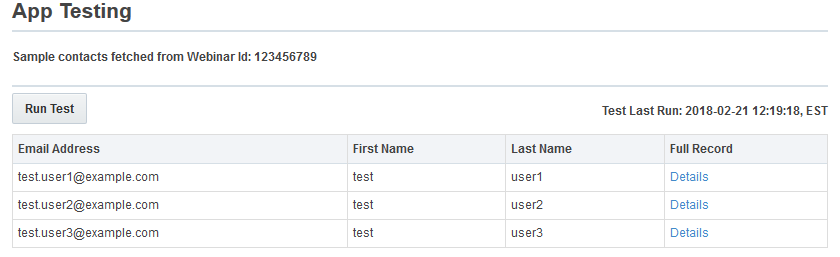 - テスト実行により、最大5つのコンタクトについて、GoToWebinarオーディエンス・サービス構成から取得されるフィールドが5つまで表示されます。「詳細」をクリックすると、各コンタクトの追加のフォーム・フィールドが表示されます。