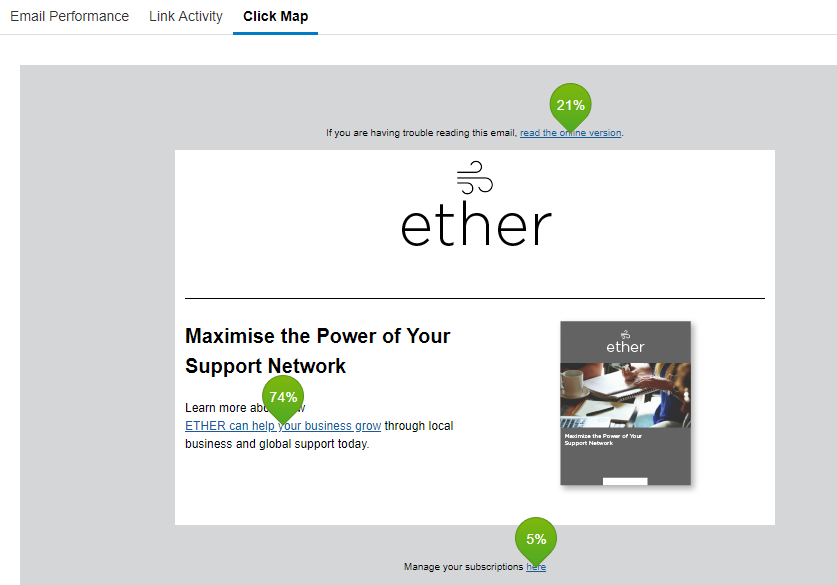 クリック・マップでは、コンタクトがEメール内のそれぞれのリンクをクリックした割合が視覚的に表現されます。リンク・パフォーマンスは、リンクがクリックされた合計に基づいています。