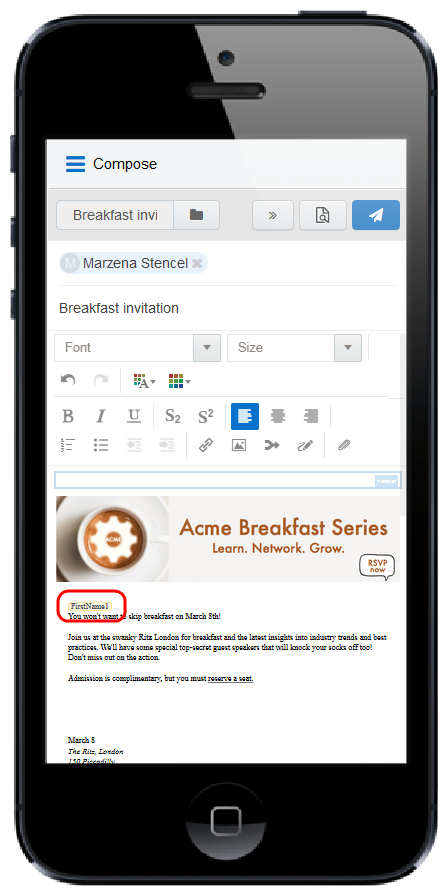 Eメールにフィールド・マージを追加する手順は、次のとおりです。