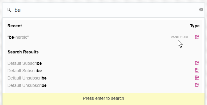- 「検索」ボックスに、ランディング・ページのタイトルまたはバニティURLの一部を入力します。最近使用した5つのランディング・ページが結果の先頭に表示され、その後に、次に一致度が高いランディング・ページが10個表示されます。ランディング・ページのバニティURLでテキストが検出された場合、結果で、そのランディング・ページに「バニティURL」タグが示されます。