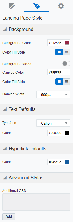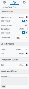 デザイン・エディタを使用すると、ランディング・ページを簡単にスタイル設定し、一意の外観を作成できます。「形式」 タブを使用して、背景のイメージやビデオ、テキストおよびハイパーリンクのデフォルトをすばやく設定したり、カスタムCSSを追加できます。