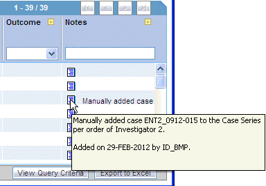 The selected case is updated with the annotation. In addition, the Notes column displays the beginning text of the annotation.