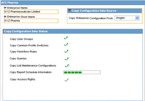 The system copies all the configuration data from the enterprise that you selected and reports status information throughout the process.