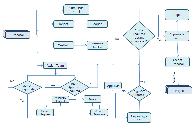 Charters or Proposals are an optional step in the path to creating a new project. Depending on the configuration of your system, you may see it displayed as either Charter or Proposal in the User Interface. New proposals can be created using the Proposal section of the UI or they can be created from an approved idea. Once created, a project proposal goes through a predetermined workflow before a final project is created from the proposal.