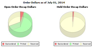 Purpose: These pie charts on the menu screen provide a graphical “snapshot” of your open and held orders as of the last time the Batch Order Control (ORD_CONTRL) job ran on or since the displayed date.