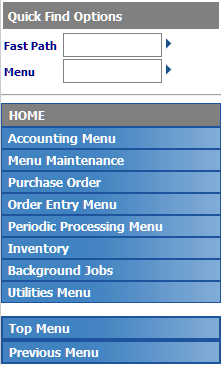 Use this field to enter a unique menu name to advance it directly without advancing through the menu tree. For example, if you enter INVENTORY in the Menu field, you advance to the Inventory Menu. If you do not know the menu name, you can click on the arrow to advance to the Select Menu Window, where you can search and select the desired menu. The Fast Path setting in the user's record controls whether menus display the Menu field. See the User Configuration guide. Alphanumeric, 10 positions; optional. |