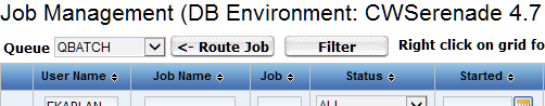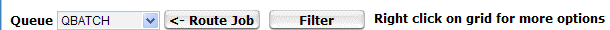 When a job is first submitted to the job queue, the system automatically chooses which job queue to use to process the job, based on the type of job submitted. However, if the job has not yet processed (its status is RDY), you can route it to a different job queue by: • Selecting the checkbox to the left of the job • Selecting the job queue from the drop-down box next to the <- Queue button • Selecting Route to Queue. This option is useful if, for example, a large job is currently active in QBATCH, and you would like to run a report job in a separate job queue so it will process quickly. |