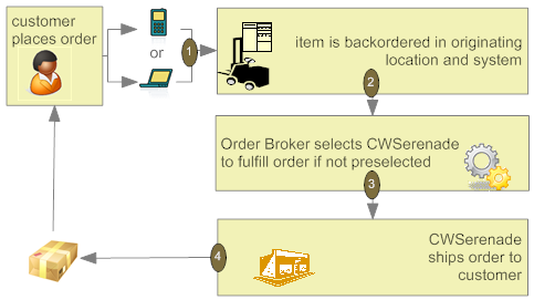 • Brokered backorders (delivery orders): When Locate receives a brokered backorder from CWSerenade, it assigns the order to a fulfilling location using standard Order Broker rules. If the selected location is part of the Store Connect system, the associates use Store Connect to accept, print, pick, and ship the order, and CWSerenade tracks the activity as with any other brokered backorder.