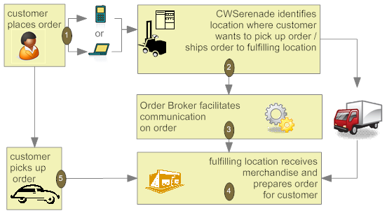 Retail pickup order: The Order Broker sends a retail pickup order to CWSerenade for fulfillment when the customer would like to pick up the order at the originating retail location, but the inventory is not available. The ship-to address on a retail pickup order sent to CWSerenade for fulfilment is the name and address of the originating store location.