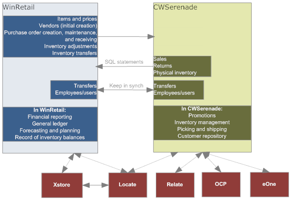 In addition to the integration between CWSerenade and WinRetail, each system can integrate separately with external systems such as Xstore, Locate, Relate, OCP, eOne, and other providers such as an authorization service.