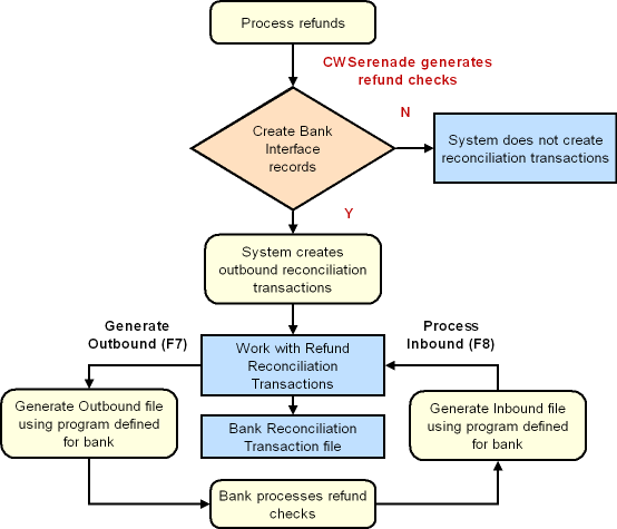 You can use bank reconciliation transactions to send refund checks to a bank for automated reconciliation and then receive the processed refund check information back into CWSerenade. Once the refund checks are reconciled, the system updates the Refund Reconciliation table.