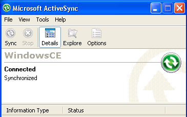 Connect the MC9090 mobile device to the Windows PC that has Microsoft ActiveSync and make sure it connects. The Microsoft ActiveSync window looks like the following when it is connected to the MC9090 mobile device: |