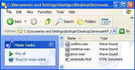 Open the Serenade folder. This folder contains: • confirm.wav file: this file is used to emit a high pitched single beep when an action on an RF screen is successful and the screen is ready to continue. • continue.wav file: this file is used to emit a medium pitched double beep when a confirmation is required from the user on an RF screen, such as selecting OK to proceed. • error.wav file: this file is used to emit a low pitched triple beep when an error occurs on an RF screen that requires user intervention. • serenade.html configuration file. |