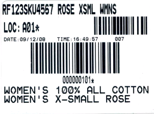 A sample RF Item label is presented below. This sample was printed using the base print program RFR0071. The base print program prints RF Item labels that are 2" high x 4" wide. Note: The sample label below is not to actual size. Your label may differ if you use a different print program.