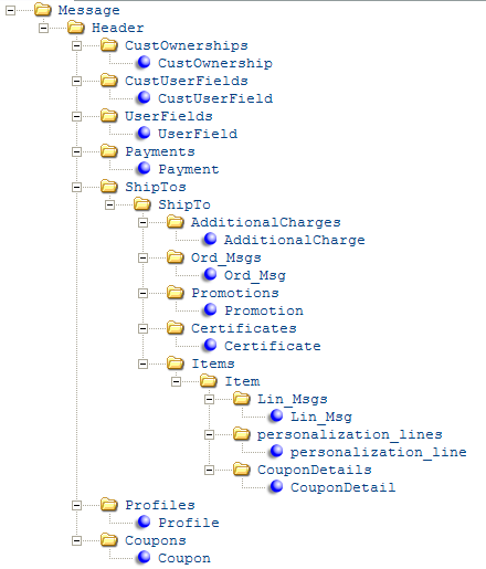 One header element is required. Special characters: If you pass a special character in the Header element, the system does not process the message and writes a message in the CWDirect Log. Example: • If you pass Mary&Joe in the sold_to_fname tag, an error message similar to the following is written in the CWDirect log: 2008-06-18 11:25:59,934 99184497 ERROR [STDERR] (43049:) (LoggerStream.java:152) [Fatal Error] :1:214: The reference to entity "Joe" must end with the ';' delimiter. • If you pass Mary& in the sold_to_fname tag, the order API returns an Invalid XML response and writes an error message similar to the following to the CWDirect log: 2008-06-18 11:10:29,315 98253878 ERROR [STDERR] (43049:) (LoggerStream.java:152) [Fatal Error] :1:110: The entity name must immediately follow the '&' in the entity reference. |