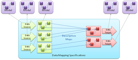データ・マッピング仕様は、ソースおよびターゲットのデータ・ストア間の論理マッピングを定義するOracle Metadata Management (OMM)の範囲内でコンテンツを形成します。このダイアグラムに示すように、データ・ストア自体は、モデル・コンテンツとして、Oracle Metadata Management (OMM)内に独立にモデル化されますが、データ・マッピング仕様に対しては外部にあります。