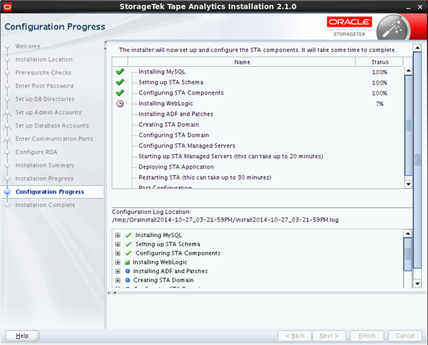 Ne fermez pas cette fenêtre ; sinon, interrompez la configuration en cours, car cela pourrait laisser certains composants dont l'installation n'est pas terminée sur le serveur.Pendant ce processus, le serveur WebLogic, les serveurs STA gérés,et l'application STA sont configurés et démarrés. Ce processus peut prendre de 30 à 60 minutes.