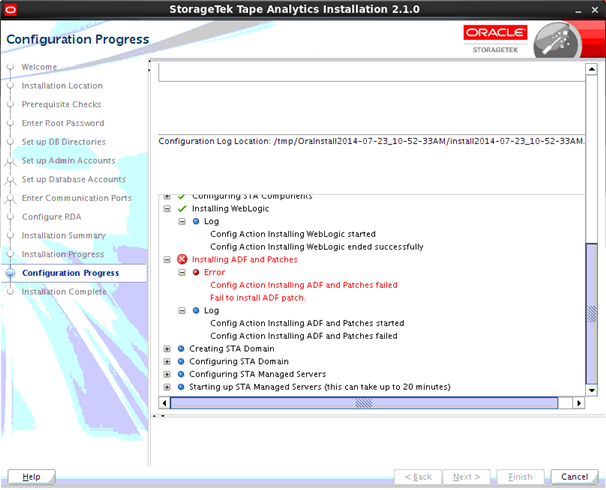 Si une tâche échoue, le programme d'installation de STA arrête et annule l'installation, et renvoie le serveur dans son état d'origine. Vous pouvez également visualiser le journal d'installation pour résoudre le problème. Pour plus d'informations, reportez-vous à la section Journaux d'installation et de désinstallation de STA.