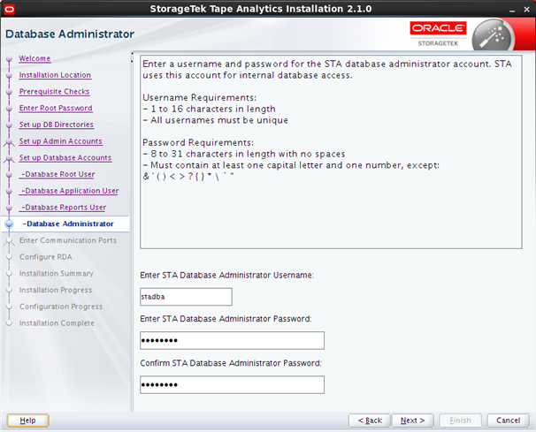 Saisissez le nom que vous souhaitez affecter au compte d'administrateur de base de données STA, stadba, par exemple.